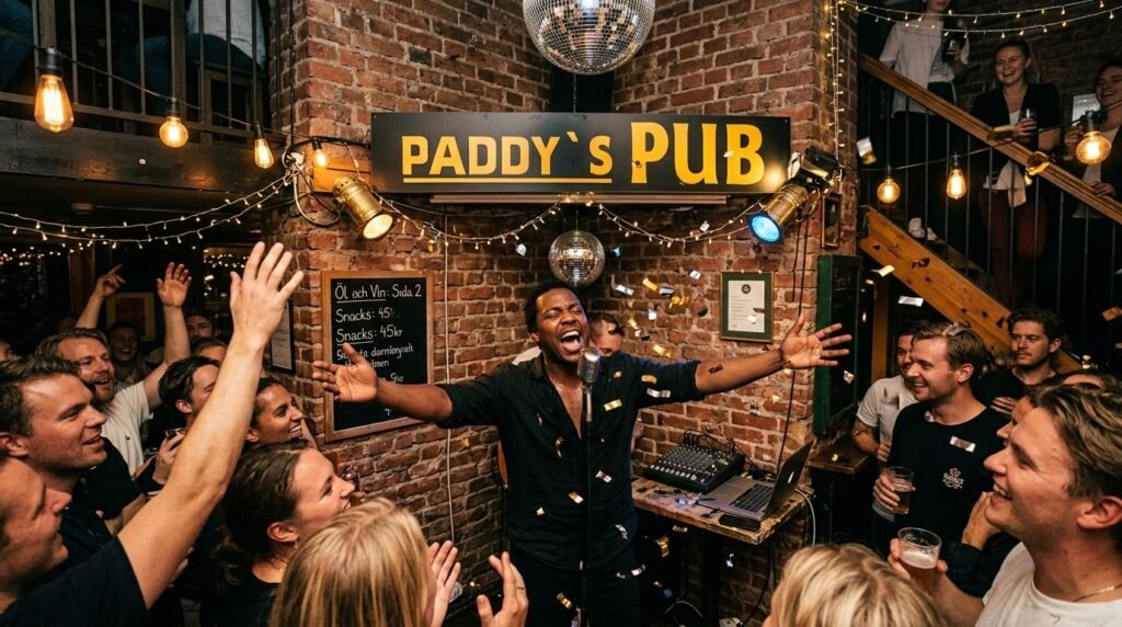 Välkommen till Paddy’s Pub i Sollentuna, en genuin irländsk kvarterskrog och sportbar som sträcker sig över tre stämningsfulla våningar. Här möts du av en varm och inbjudande atmosfär där den traditionella pubkänslan står i centrum. För dig som älskar att stå i strålkastarljuset erbjuds karaoke under utvalda onsdagar och lördagar, vilket ger en perfekt möjlighet att bjuda på sig själv. Utöver karaokescenen bjuder vi även på livemusik och trubadurer på fredagar.
